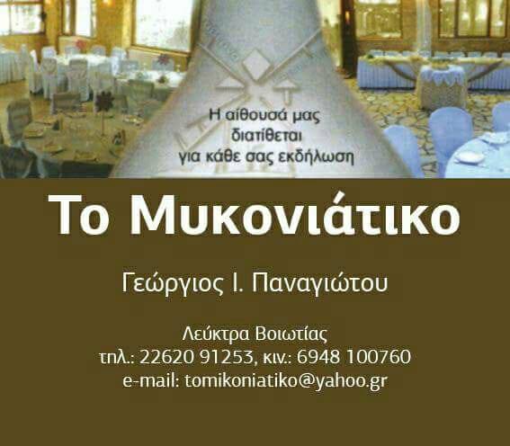 Μόλις 30 λεπτά από την Θήβα και μιάμιση ώρα από την Αθήνα, στο πανέμορφο και γραφικό χωριό Λεύκτρα Βοιωτίας, θα βρείτε και την δεύτερη ταβέρνα που διαθέτουμε “Το Μυκονιάτικο”.
