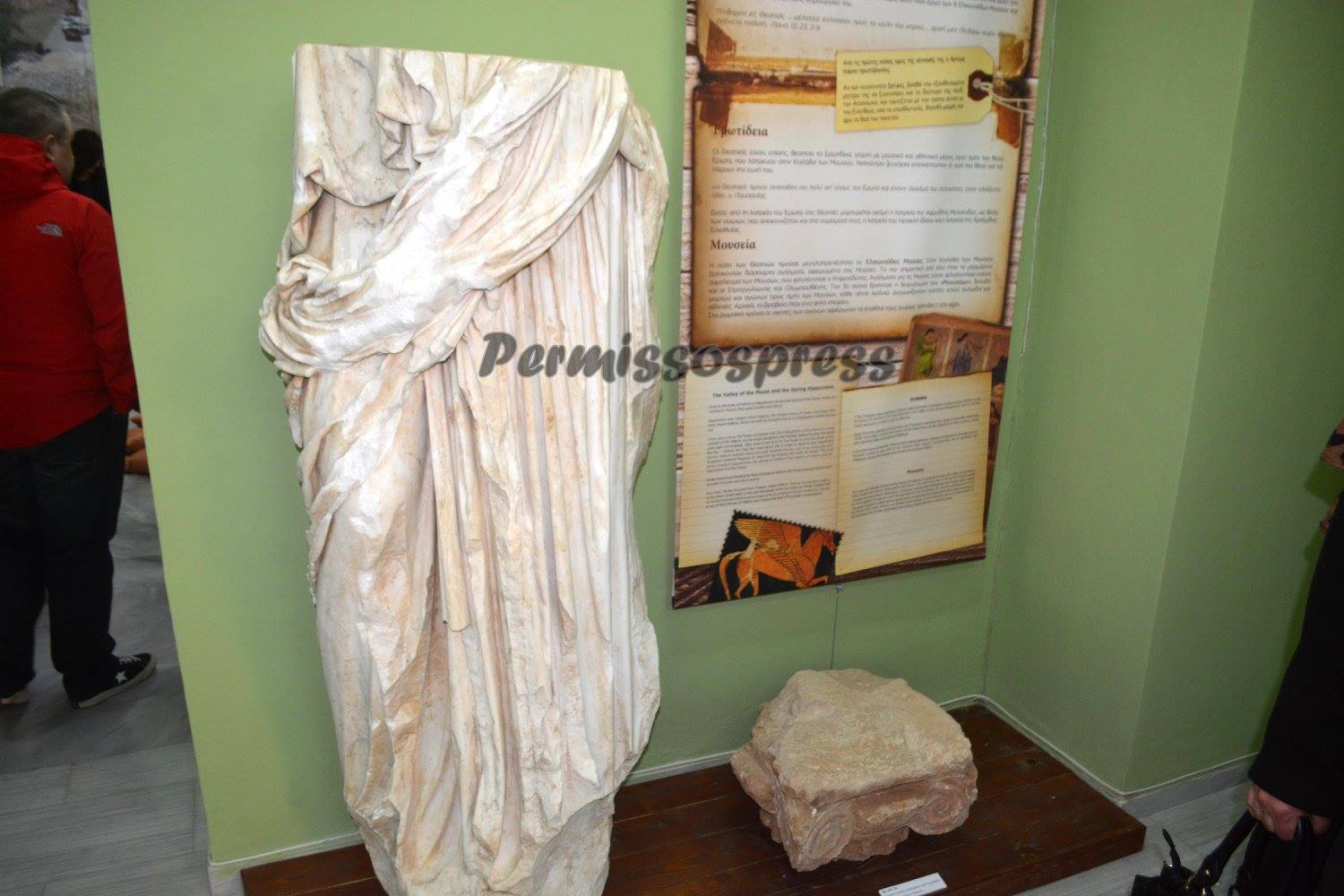 Έτσι, στην πρώτη αίθουσα παρουσιάζονται οι μύθοι, οι μάχες, οι λατρείες, το τοπικό εργαστήριο γλυπτικής, η παρουσία των Μουσών, και τα ταφικά έθιμα που μαρτυρούν πάντα τις αντιλήψεις και τις αγωνίες των ανθρώπων.
