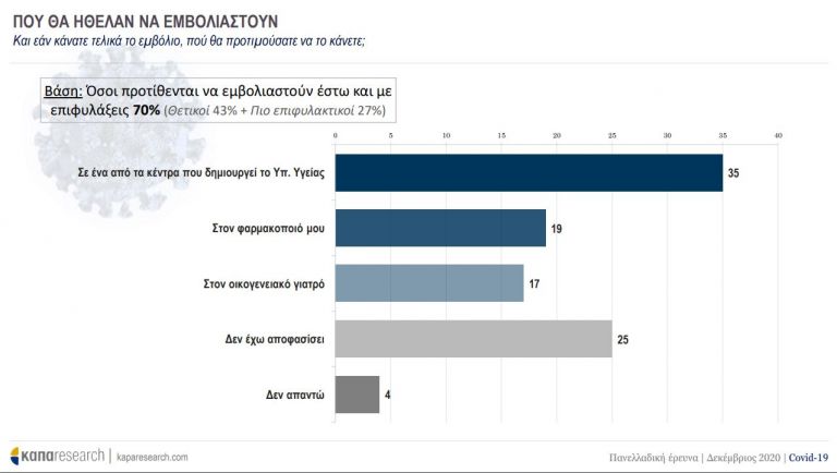Το 35% των ερωτηθέντων δηλώνει ότι θα επιθυμούσε να εμβολιαστεί σε ένα από τα κέντρα που δημιουργεί του υπουργείο Υγείας, το 19% στον φαρμακοποιό του, ενώ ένα 17% στον οικογενειακό γιατρό. Στην ερώτηση εάν όλα τα εμβόλια έπαιρναν έγκριση από τις αρχές οι πολίτες σε ποσοστό 40% έχουν δηλώσει ότι δεν έχουν αποφασίσει ενώ ποσοστό 32% δηλώνουν ότι θα επέλεγαν τον εμβόλιο της Pfizer και 10% το εμβόλιο του Πανεπιστημίου της Οξφόρδης…