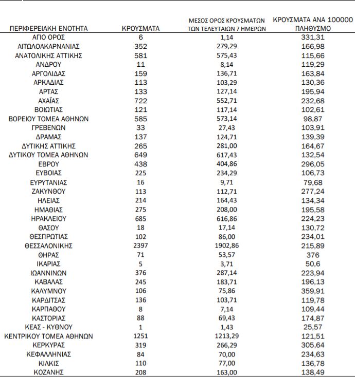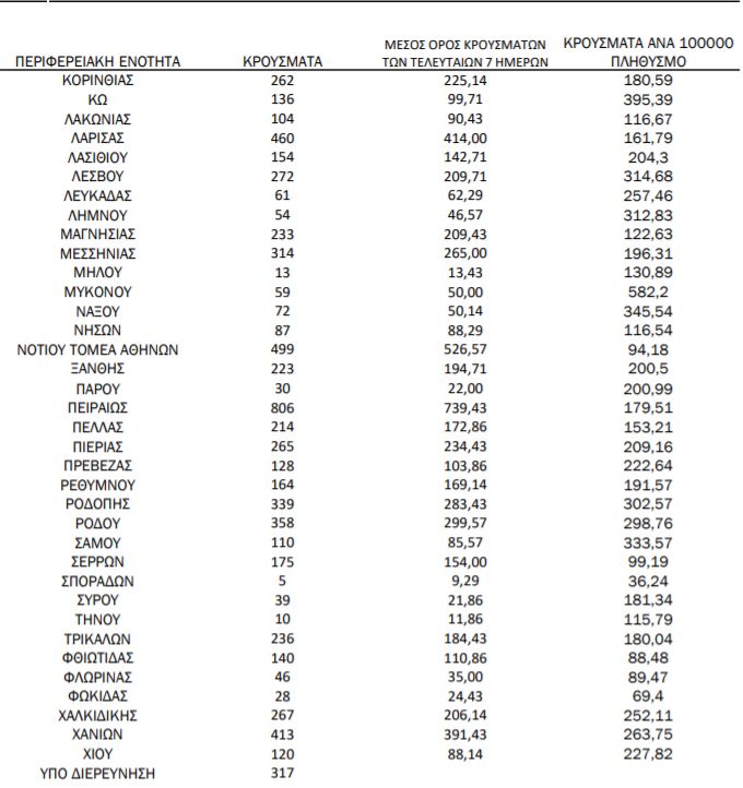 Το χάρτη συμπληρώνουν η Φωκίδα με 28 και η Ευρυτανία με 16, έχοντας τα λιγότερα κρούσματα και σε αντιστοιχία ανά 100.000 κατοίκους.