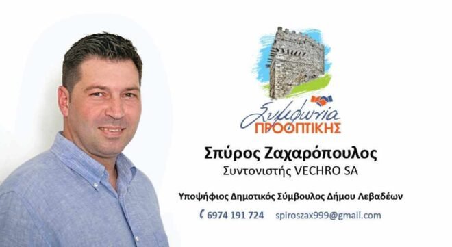 Ονομάζομαι Σπύρος Ζαχαρόπουλος και επέλεξα να είμαι υποψήφιος δημοτικός σύμβουλος Λεβαδεων με τον συνδυασμό «Συμφωνία Προοπτικής» με υποψήφιο Δήμαρχο, τον νυν Δήμαρχο Λεβαδέων, Γιάννη Ταγκαλέγκα.