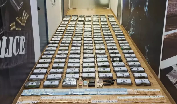Για τον τερματισμό της δράσης τους, πραγματοποιήθηκε αστυνομική επιχείρηση πρωινές ώρες χθες, Τετάρτη 22/05/2024, κατά τη διάρκεια της οποίας εντοπίστηκε ο 48χρονος και στην κατοχή του βρέθηκαν με σκοπό την περαιτέρω διακίνηση -180- αυτοσχέδιες νάιλον συσκευασίες με περιεχόμενο κοκαΐνη, συνολικού μικτού βάρους -210- κιλών και -300- γραμμαρίων.
