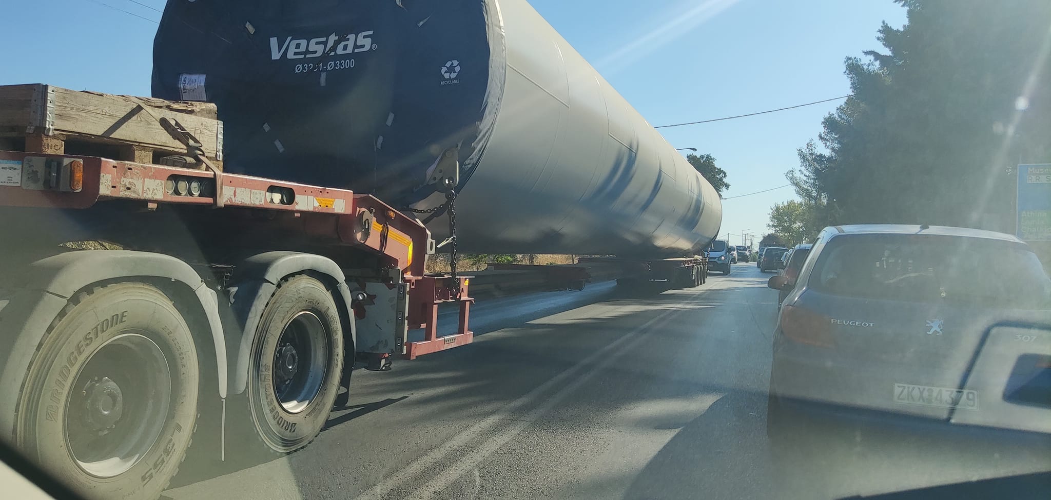 ΣΕ ΠΟΙΟ ΒΟΥΝΟ ΠΑΤΕ; Διακοπή κυκλοφορίας λίγο πριν μπούμε στο Πυρί στην είσοδο της Θήβας, προκειμένου να περάσουν μεγάλες νταλίκες με θηριώδεις κατασκευές που παίρνουν το δρόμο της εγκατάστασης, κατακλύζουν και παραμορφώνουν τα βουνά μας στο βωμό του «εθνικού συμφέροντος». Το «εθνικό συμφέρον» βέβαια έχει νόημα όταν διαχέεται στους πολίτες. Αυτό που βλέπουμε μέχρι τώρα όμως, είναι ανεμογεννήτριες και φαραωνικά φωτοβολταϊκά να έχουν κατακλύσει βουνά και καλλιεργήσιμες εκτάσεις ακόμα και υψηλής παραγωγικότητας και παρόλα αυτά, να έχουμε σταθερά από τις ακριβότερες τιμές χοντρικής στην Ευρώπη και να μην υπάρχει κανένα…
