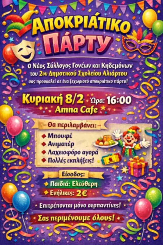 Αποκριάτικο πάρτυ από το Σύλλογο γονέων και κηδεμόνων του 2ου Δημοτικού Σχολείου Αλιάρτου 7 Φεβρουαρίου, 20267 Φεβρουαρίου, 2026 Permissos Newsroom Ακολουθήστε το Permissos.gr στο Google News